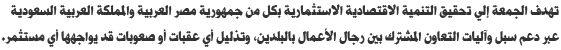 وتستهدف الجمعة تحقيق التنمية الاقتصادية الاستثمارية بكل من جمهورية مصر العربية والمملكة العربية السعودية عبر دعم سبل وآليات التعاون المشترك بين رجال الأعمال بالبلدين، وتذليل أي عقبات أو صعوبات قد يواجهها أي مستثمر، إلى جانب تمهيد أرضية ملائمة للحوار بين رجال الأعمال من الجانبيين، لخلق المناخ المناسب لضخ مزيد من الاستثمارات في كل من السوق المصري والسعودي.