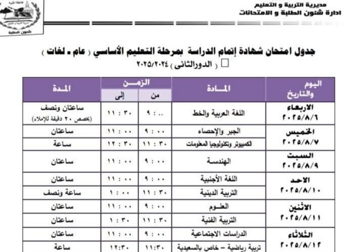 رسميًا…جداول امتحانات الدور الثاني لصفوف النقل والشهادة الإعدادية بالجيزة