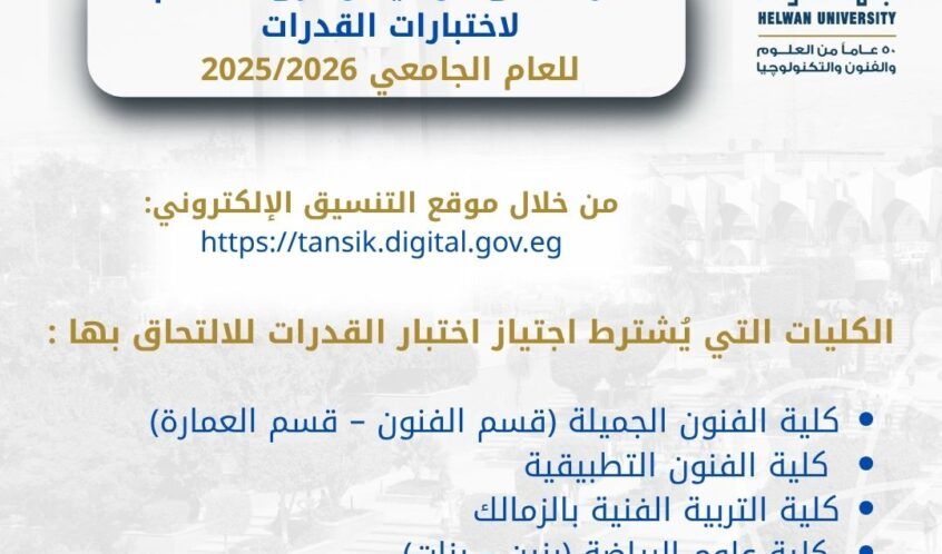 أعلنت جامعة حلوان عن بدء التقديم لأداء اختبارات القدرات المؤهلة للالتحاق ببعض كليات الجامعة للعام الجامعي 2025/2026، وذلك خلال الفترة من يوم السبت الموافق 12 يوليو 2025 وحتى يوم …